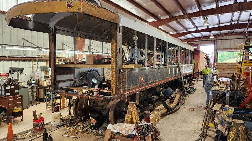 Car 60 in the shop at R&GVRRM in 2023 photo: https://www.facebook.com/photo.php?fbid=694780975998554&set=pb.100063999736016.-2207520000&type=3 |
