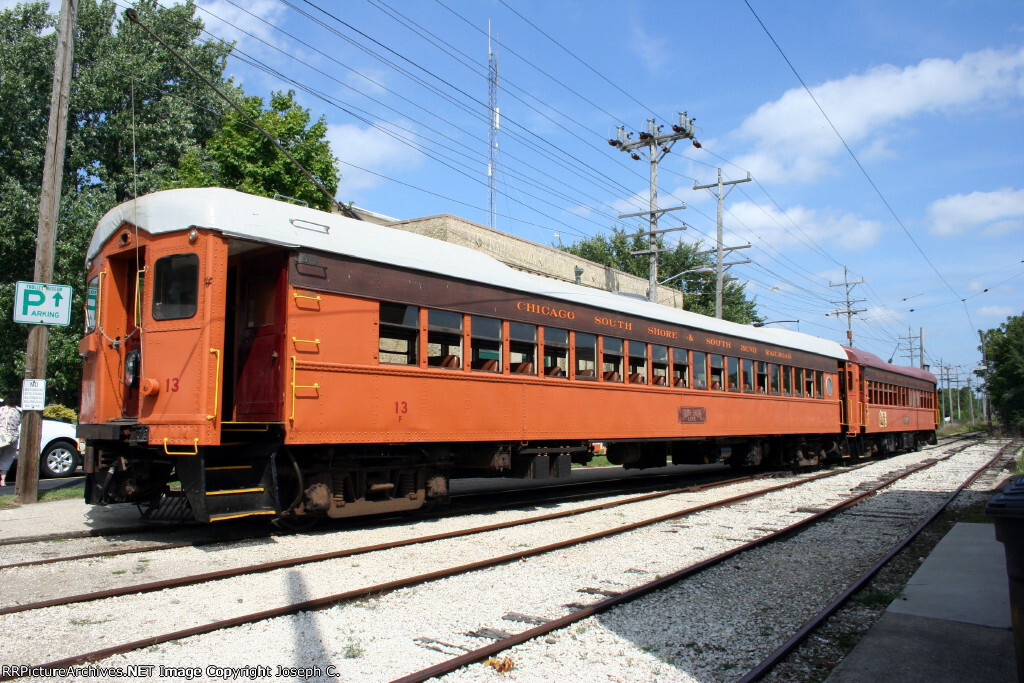 Car 13 in operation at ETER in 2022 Wikipedia photo: https://en.wikipedia.org/wiki/File:East_Troy_Electric_Railroad_October_2022_01_%28Chicago_South_Shore_and_South_Bend_No._13%29.jpg |