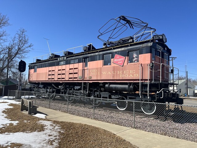 Locomotive E57B on display in Harlowton, Montana, in 2023 Flickr photo: https://www.flickr.com/photos/190098207@N07/52759200808/ |