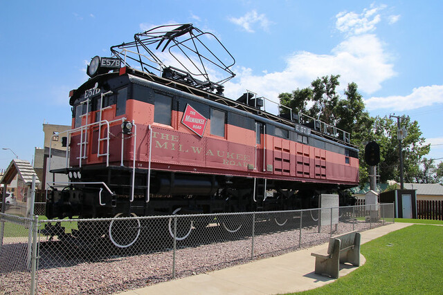 Locomotive E57B on display in Harlowton, Montana, in 2017 Flickr photo: https://www.flickr.com/photos/56878150@N04/36153760945/ |