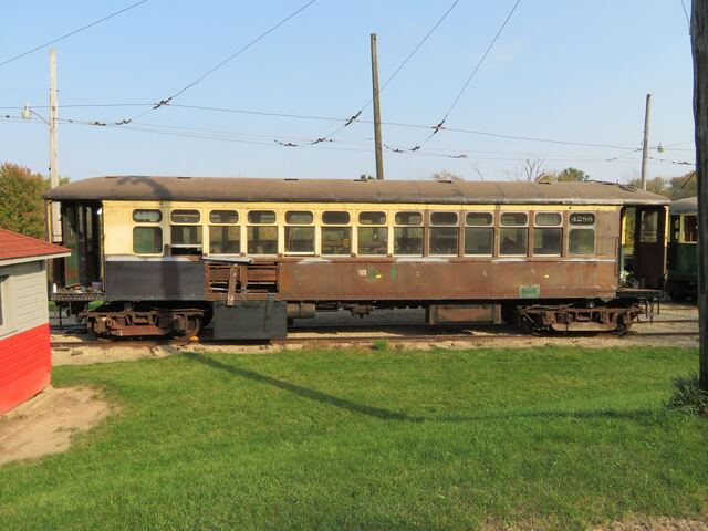 Car 4288 during switching at FRTM in 2020 Fox River Trolley Museum photo: https://www.foxtrolley.org/in-the-news/9368018 |