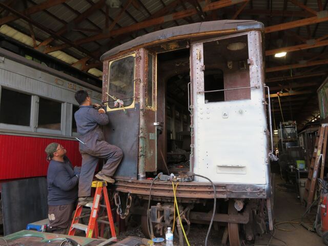 Car 4288 in the shop at FRTM in 2020 Fox River Trolley Museum photo: https://www.foxtrolley.org/in-the-news/9238545 |